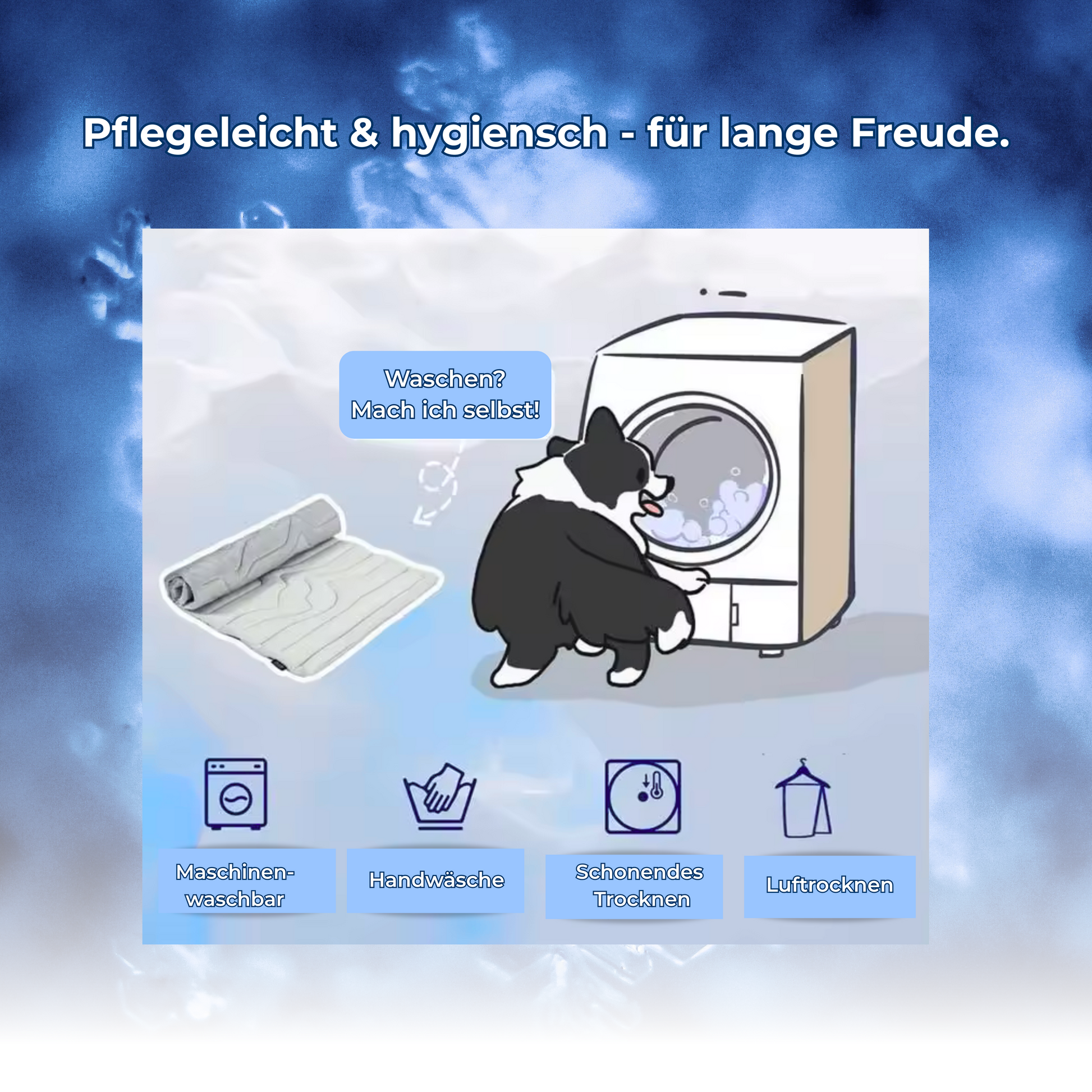 Unsere Kühlmatte ist besonders pflegeleicht: Du kannst sie bei Bedarf ganz einfach in der Waschmaschine reinigen – am besten im Schonwaschgang bei max. 30 °C. Bitte verwende dabei ein mildes Waschmittel und verzichte auf Bleichmittel, Weichspüler oder den Trockner.