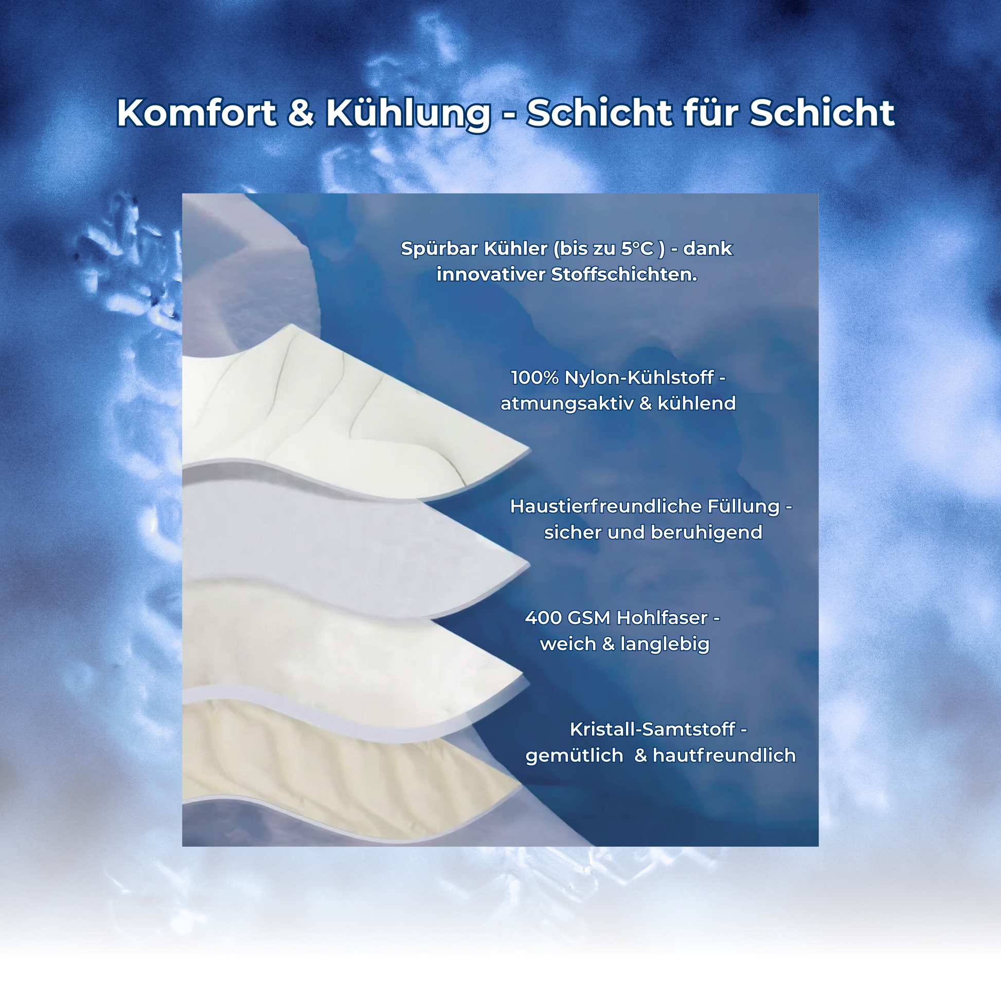 🐾 Das Besondere: Die innovative mehrschichtige Struktur sorgt nicht nur für Kühlung, sondern auch für Gemütlichkeit. Dein Hund spürt sofort Entlastung – und du kannst beruhigt sein, dass er sicher und entspannt liegt.